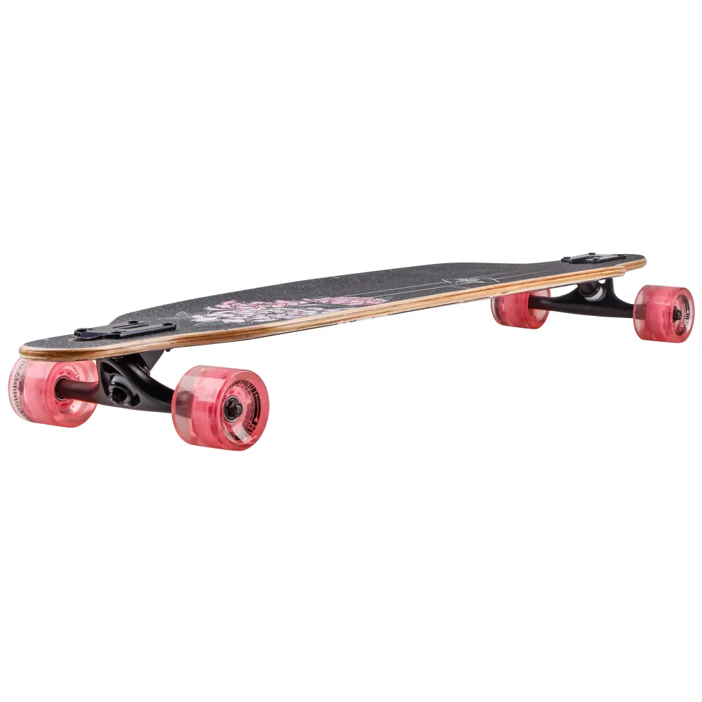 Дека имеет размеры 41 дюйм. Покрыта нескользящей брендовой шкуркой. Верхняя часть обозначена фирменным принтом. 7-дюймовая подвеска из высокопрочного алюминия качественная, проверена многочисленными отзывами райдеров. Колеса диаметром 70 мм, шириной 51 мм и параметрами жесткости 82А изготовлены из нестираемого долговечного материала. Вместе с подшипниками ABEC 7 CHROME и бушингами жесткостью 95 А езда превращается в удовольствие. Технические параметры модели позволяют развлекаться и маневрировать. Для заказа лонгборда предлагаем связаться с менеджером интернет-магазина.