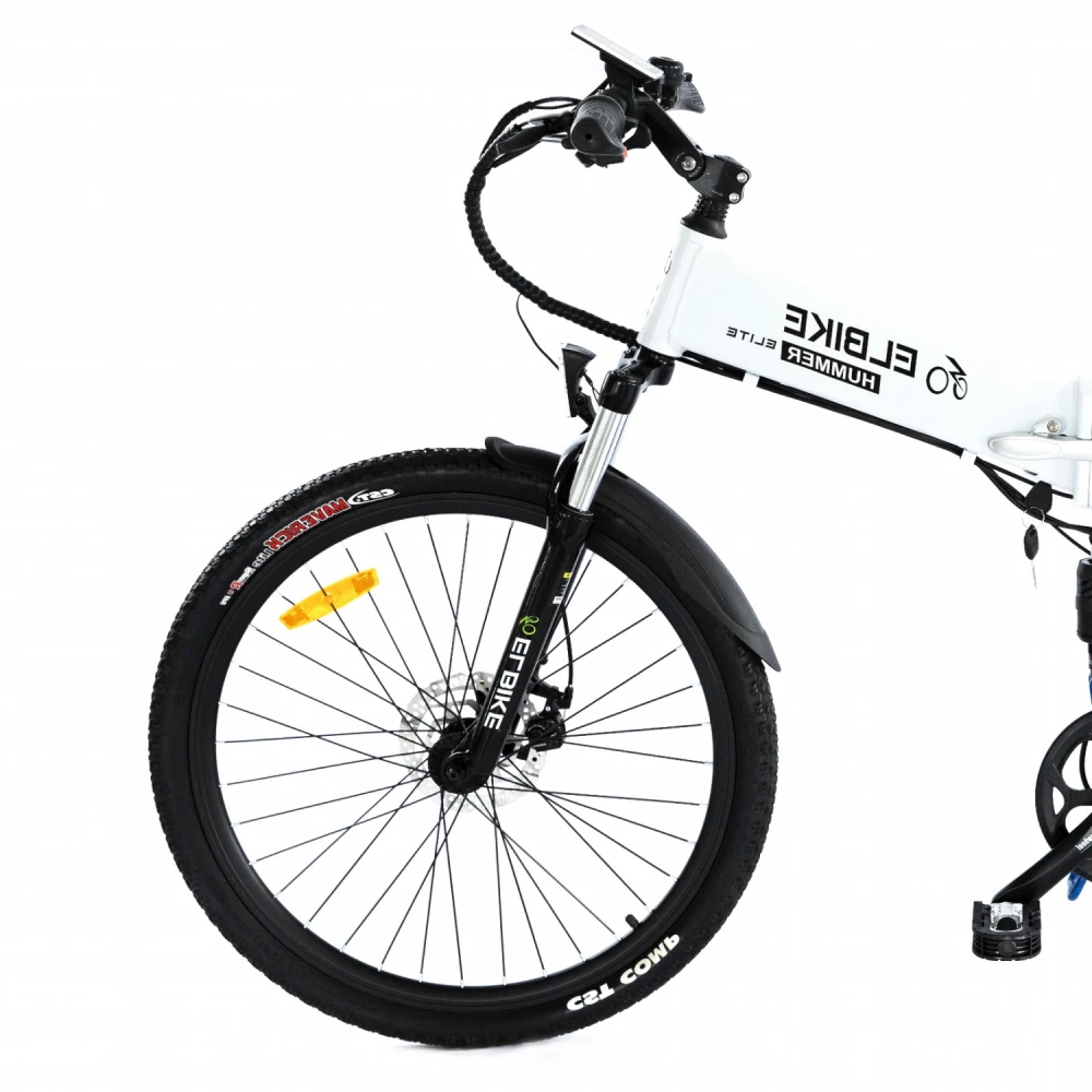Электровелосипед Elbike HUMMER ELITE 13 Синий – выглядит круто на фоне другой, аналогичной техники. Рама выглядит массивно и современно за счет брендовой надписи и наличия в ней емкой батареи. 26 дюймовые колеса с цепкими покрышками предназначены для езды по бездорожью и другой проблематичной местности. Также техника может использоваться в качестве ежедневного варианта.