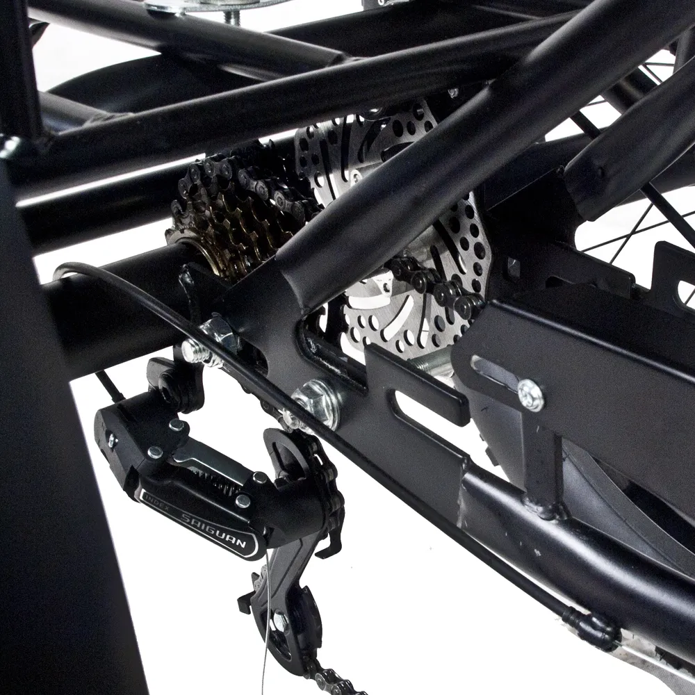 Современный трицикл представлен стильным заметным дизайном. Вызывает удивление и  зависть со стороны других райдеров. Основная конструкция техники изготовлена из долговечного прочного металла, не деформирующегося при максимальной нагрузке 180 кг. Тормозная система – дисковая, механическая, гарантирует своевременное торможение и безопасность передвижения пользователя.